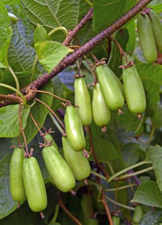 Актинидия коломикта "Сладкая палочка" Листопадная лиана, вырастающая на опоре до 7-8, иногда 15 и более метров, диаметр ствола 2-5 см. Родина- Дальний Восток. Эта актинидия не только плодовое, но и прекрасное декоративное растение для вертикального озеленения. Выгодно отличается скоростью роста – при хороших условиях, поливе и удобрениях лиана за сезон может вырасти на 1,5 м и более. Без опорыпринимает форму кустарника 2-3 м высотой. Актинидия коломикта – самый зимостойкий вид, его можно успешно возделывать в открытом грунте в северных регионах садоводства. Плоды напоминают крупные ягоды крыжовника или мелкие киви, богаты витаминами, созревают в разное время, что затрудняет сбор урожая. Плодоносить кустарник начинает на 3-4 год после посадки. Плоды этого сорта созревают в конце августа, оливково-зелёные, цилиндрические, длинные, массой до 4,3 г. Вкус кисло-сладкий, с ананасным ароматом. Содержание аскорбиновой кислоты 1890 мг%, сахаров до 12,0%. Сорт высокозимостойкий (до -40 гр.). Для плодоношения необходимо наличие мужского растения, например, сорта "Фестивальный" (на 1 мужское до 5-7 женских).