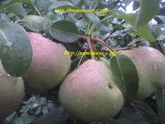 Осенний сорт.Плоды широкогрушевидные, среднего размера. Окраска в момент съемной зрелости: основная зеленая, покровная с небольшим загаром на солнечной стороне; в период потребительской зрелости основная зеленовато-желтая, покровная – размытый румянец по меньшей части плода.
